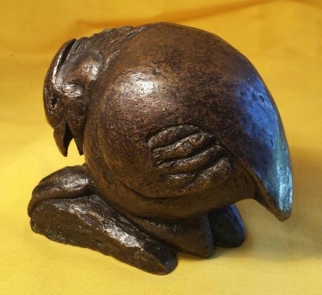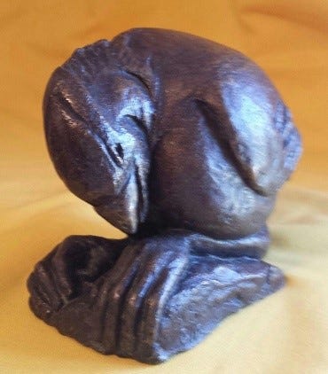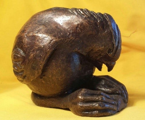 For most South Africans the apartheid era was one of unrelenting dusk. Hope was a fragile commodity. Paradoxically the anthem of liberation was one of great hope: “Nkosi sikelel’ iAfrika,” a Christian hymn calling for God to bless Africa amidst the pain and struggle. Fragile hope amidst terrible pain, it is powerfully evoked in Gert’s Nkosi. The young vulnerable bird is wearied and almost overwhelmed by the obstacles to its normal growth and development. The pathos is tangible. The head is bowed beneath the weight of the struggle and yet it is slightly turned upwards as if to refuse to relinquish the possibility of redemption. Few works capture so integrally the terrible juxtaposition of pain and hope in human (note the hands) experience.