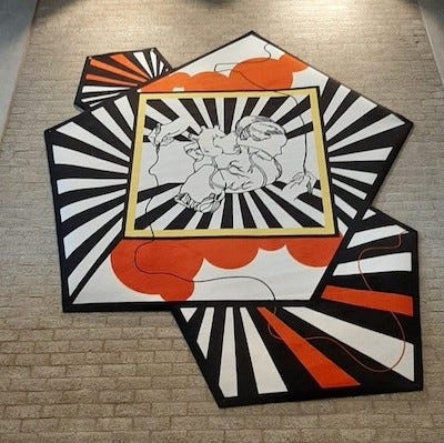 At the occasion of the 140th anniversary of the VU University (Vrije Universiteit) in 2020, a work of art by Wafae Ahalouch was installed at the entrance to the auditorium. This wall tapestry, titled Trinity: Kuyper Revisited, captures Kuyper’s idea of unity and cohesion in created reality. The artist was struck by Kuyper’s statement that “God created a magical union between head, heart, and hand.” The tapestry’s centre shows the outlines of the heads of a man and a woman, an anatomical heart and two hands holding pens that have drawn long lines. The drawing is placed in a yellow-edged square within a pentagon, with two three-pointed projections above and below. The outward directed points that contain black, white and orange stripes (or spheres!) create a dynamic effect of radiation, enhanced by the orange clouds. The artwork pays tribute to Kuyper’s impact – with head, heart and hands – on all of reality.